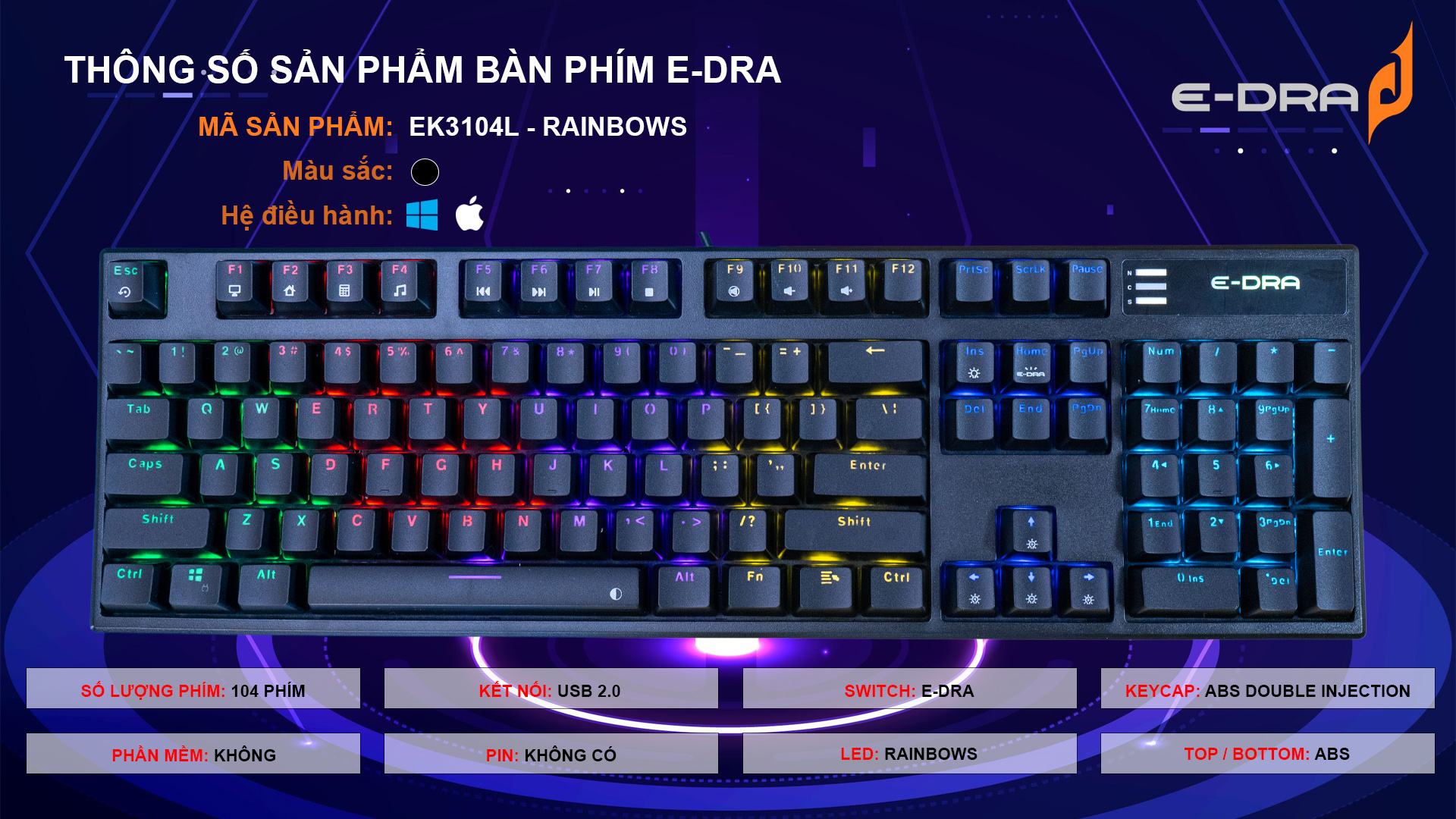 Bàn phím cơ E-dra EK3104L trang bị switch độc quyền từ E-dra với 3 phiên bản Blue, Red và Brown, có độ bền cao và cảm giác gõ gần như tương đương với các loại switch cao cấp hiện nay.