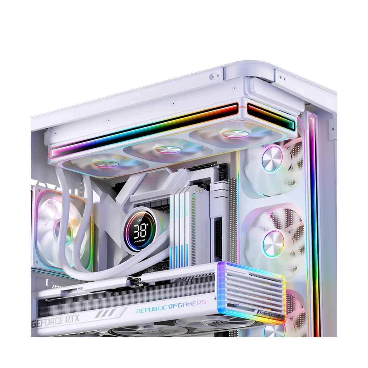 Phần khung được chế tạo từ hợp kim nhôm kết hợp nhựa cao cấp, giúp giảm rung và tăng độ bền trong quá trình sử dụng lâu dài. Thiết kế liền khối 242mm không chỉ giúp tối ưu không gian mà còn hỗ trợ lắp đặt nhanh chóng. Hệ thống dây cáp đơn giản – chỉ cần một đầu cắm PWM 4-pin cho quạt và một đầu ARGB 3-pin cho LED – mang đến sự gọn gàng, dễ quản lý và tăng tính thẩm mỹ cho toàn hệ thống.