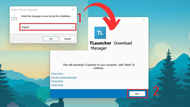 Bước 2: Chọn ngôn ngữ bạn muốn sử dụng (ví dụ: Tiếng Anh) rồi nhấn “Tiếp tục” để bắt đầu. Hướng dẫn cách đưa Minecraft TLauncher về máy của bạn.