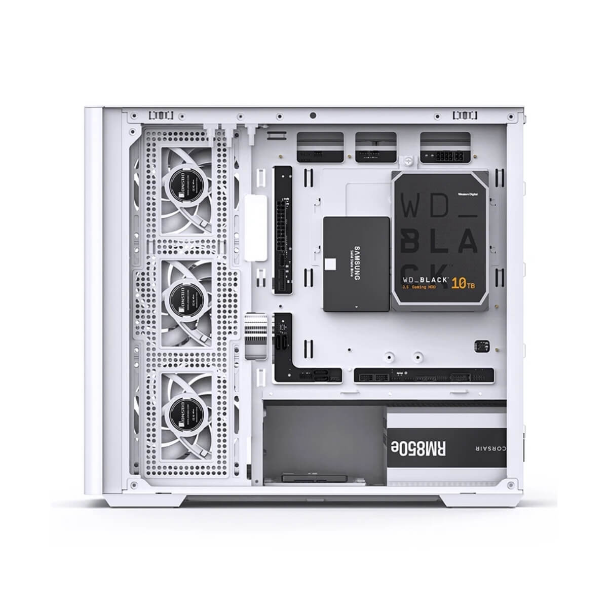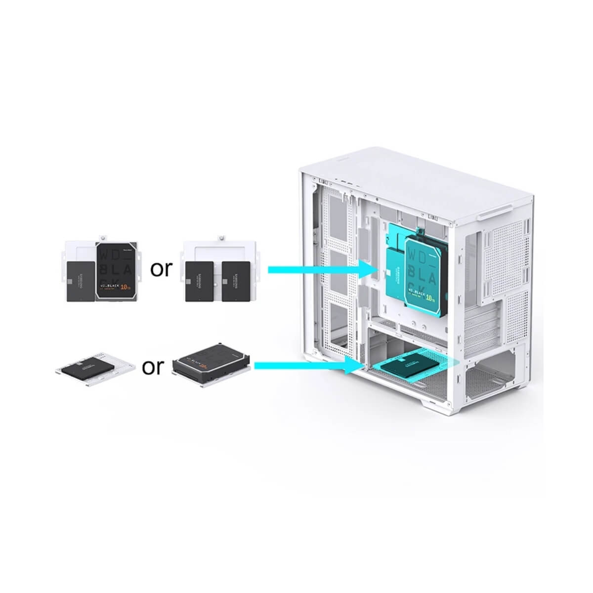 Sở hữu thiết kế thông minh, Case Jonsbo D300 White (mATX) cung cấp nhiều tùy chọn khe cắm ổ cứng, phù hợp với nhu cầu lưu trữ đa dạng của người dùng. Bạn có thể lắp đặt 2 ổ SSD 2.5 inch cùng 1 ổ HDD 3.5 inch, hoặc chọn cấu hình tối ưu hơn với 3 ổ SSD 2.5 inch hay kết hợp 2 SSD 2.5 inch và 2 HDD 3.5 inch. Khả năng linh hoạt này giúp bạn dễ dàng mở rộng bộ nhớ mà không gặp trở ngại.