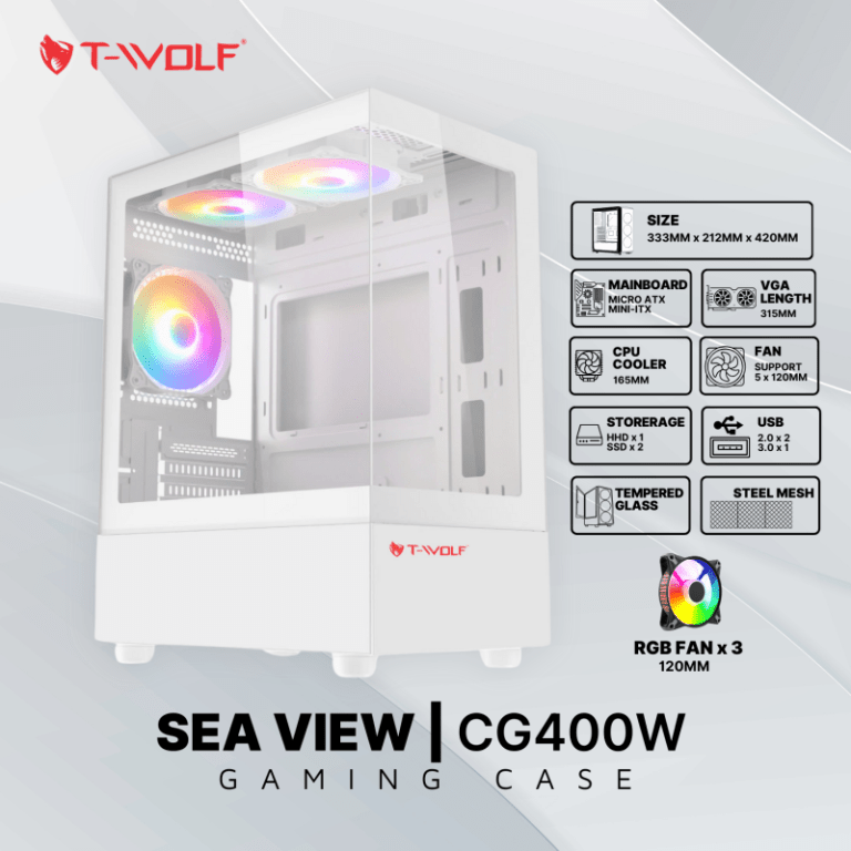 Case T-wolf Sea View CG400W Gaming White/Trắng (Kèm 3Fan Led)