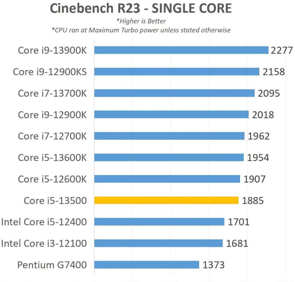 Khi nói về điểm chuẩn, CPU Intel Core i5 13500 đạt 1834 điểm (PL – 65 W) và 1885 điểm (PL – không giới hạn) trong bài kiểm tra đơn luồng Cinebench R 23. Ở tổng thể, mẫu CPU Intel Core i5 đã ghi được 17104 điểm (PL 1 – 65 W) và 21103 điểm (PL 1 – Không giới hạn). Mặc dù điểm số lõi đơn không tăng hiệu suất đáng kể nhưng điểm số đa luồng đã tăng 23% với cấu hình sức mạnh không giới hạn.