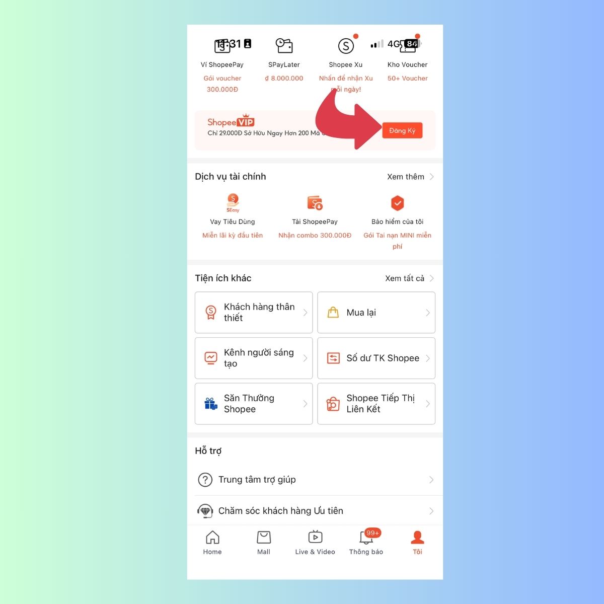 Truy cập ứng dụng Shopee trên điện thoại, vào mục “Tôi”, sau đó chọn “Đăng ký” tại phần ShopeeVIP.
