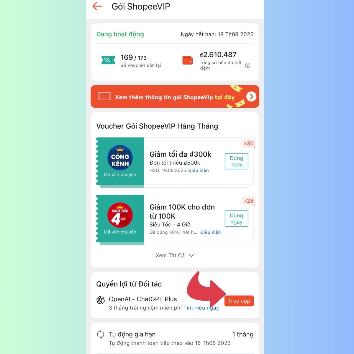 - Điều kiện nhận: Là thành viên ShopeeVIP, chưa từng đăng ký tài khoản ChatGPT Plus, và sở hữu thẻ tín dụng hoặc thẻ ghi nợ quốc tế còn hiệu lực để kích hoạt.
