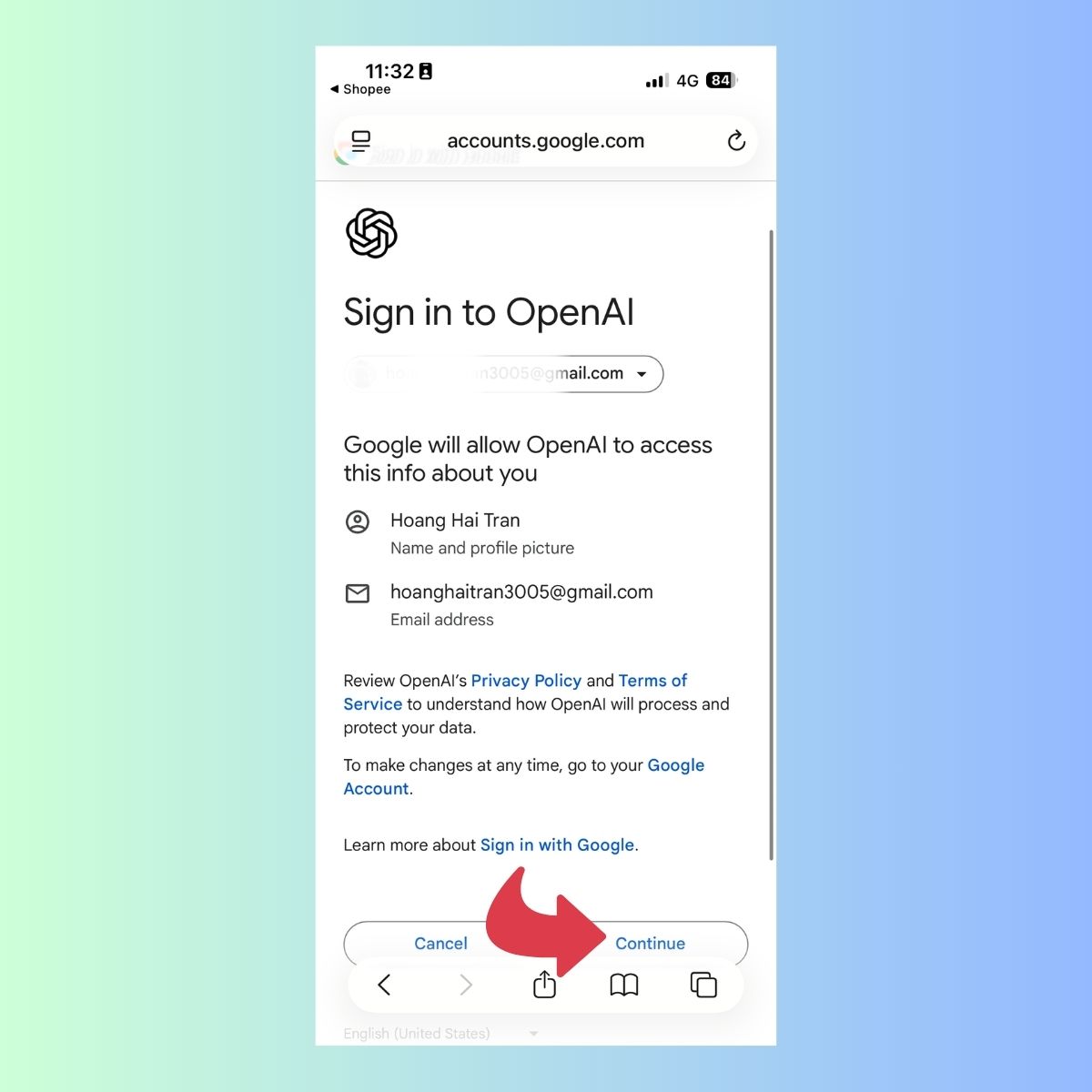 Bạn sẽ được chuyển đến trang chính thức của OpenAI. Chọn “Continue”.
