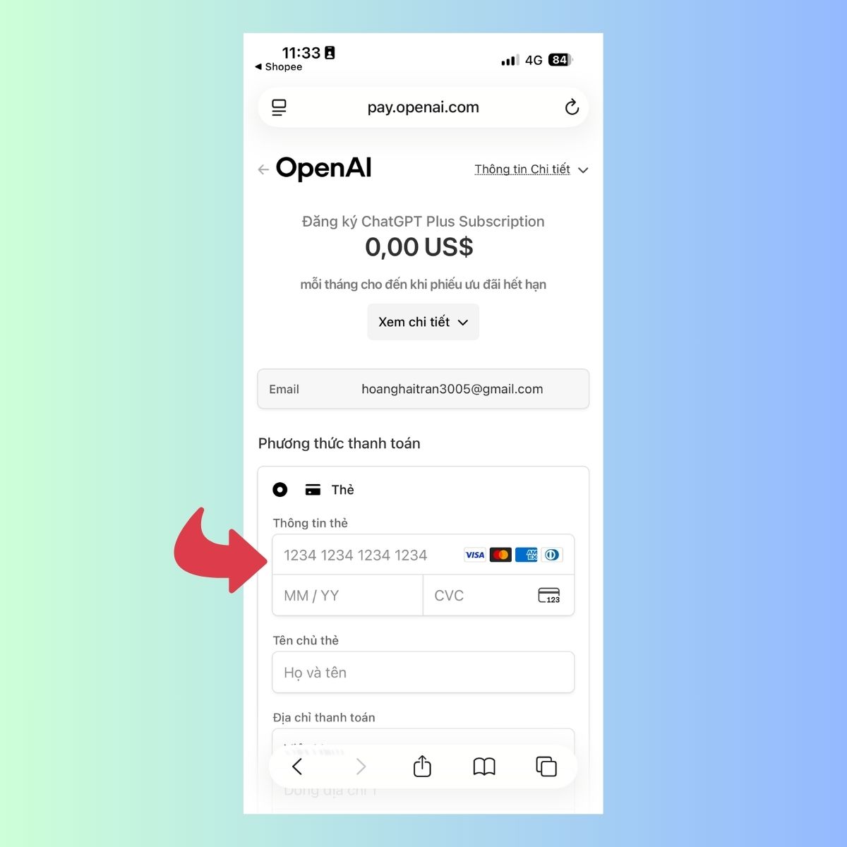 Dù giá hiển thị là 0$, nhưng bạn vẫn cần nhập thông tin để OpenAI xác minh. Trong suốt 3 tháng miễn phí, bạn sẽ không bị trừ phí.