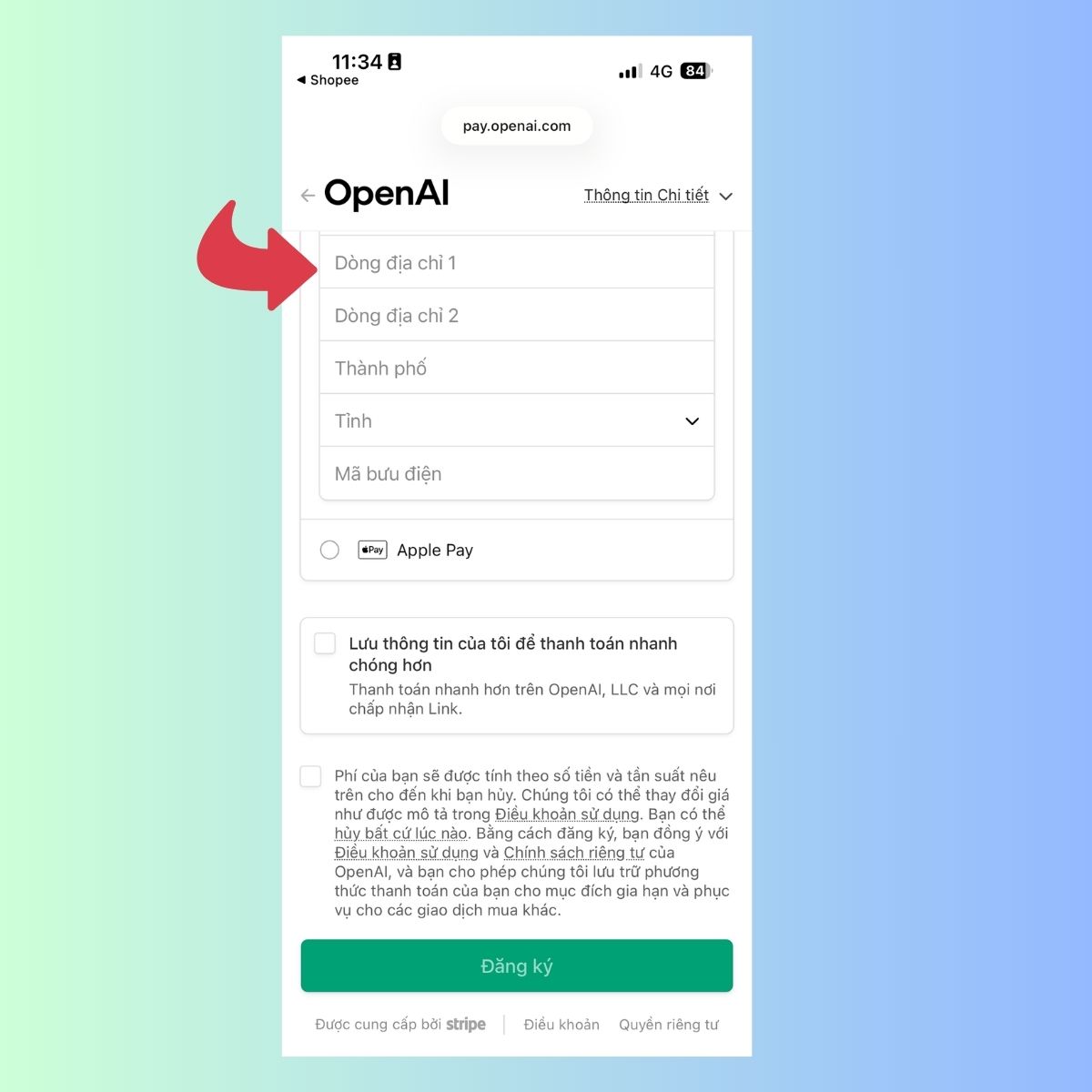 Cung cấp thông tin thẻ Visa/Mastercard cùng địa chỉ thanh toán.