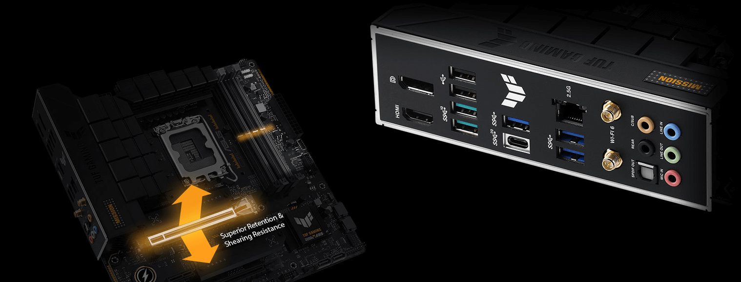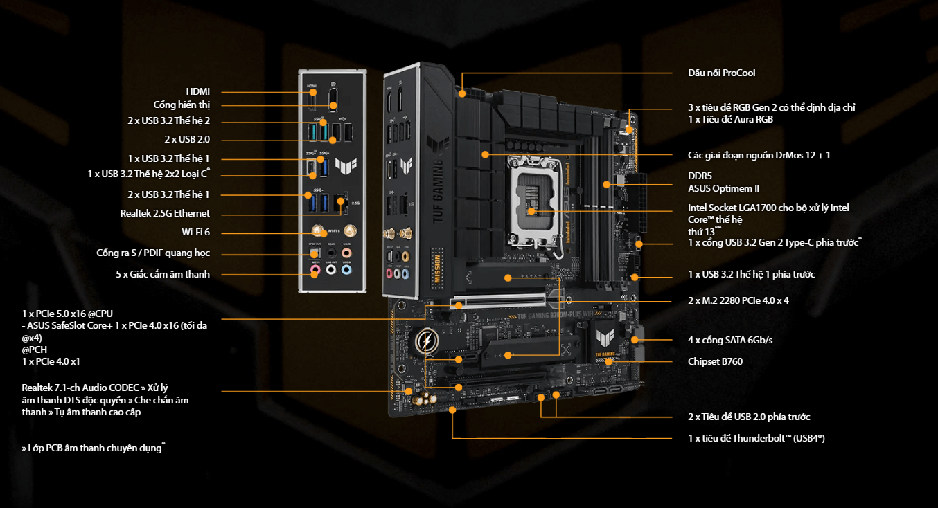Mainboard ASUS B760M Tuf Gaming Plus Wifi D5 có đầy đủ các tính năng cốt lõi của bộ vi xử lý Intel mới nhất và tích hợp chúng với các tính năng sẵn sàng chơi game và độ tin cậy đã được kiểm chứng. Được xây dựng với các tính năng cấp quân sự, giải pháp năng lượng được cải thiện và hệ thống làm mát tiên tiến, bo mạch chủ này vượt quá mong đợi với hiệu suất vững vàng để chơi game marathon. Bo mạch chủ TUF GAMING cũng trải qua kiểm tra độ tin cậy khắt khe nhằm chứng minh rằng chúng có thể giải quyết các điều kiện mà những người khác có thể thất bại.