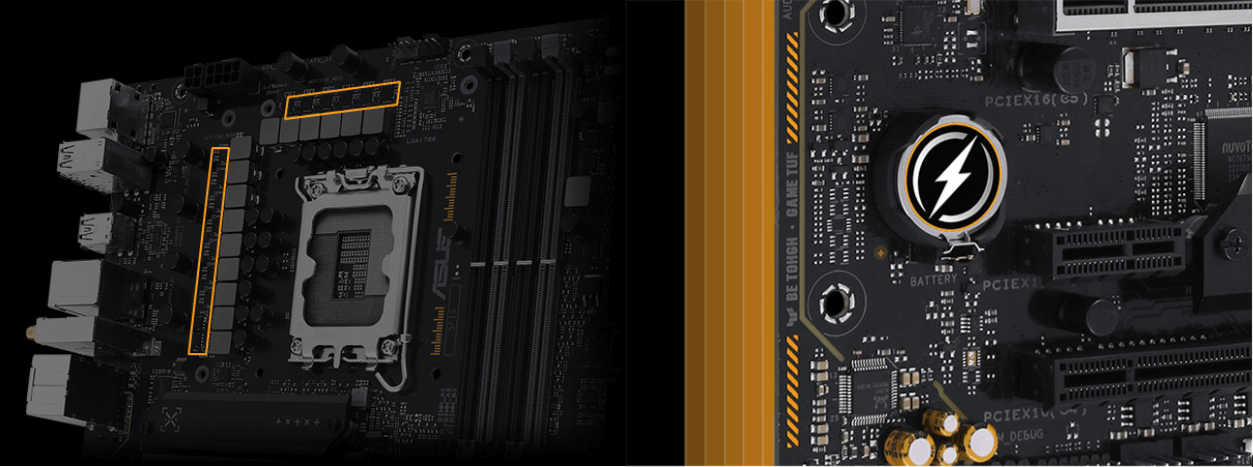 TUF Cuộn cảm TUF cấp quân sự được chứng nhận cung cấp sức mạnh ổn định cho CPU, cải thiện độ ổn định của hệ thống, tụ điện TUF cuộn cảm TUF cấp quân sự được chứng nhận cung cấp sức mạnh ổn định cho CPU, cải thiện độ ổn định của hệ thống 52 % Nhiệt độ, 2,5 x tuổi thọ.
