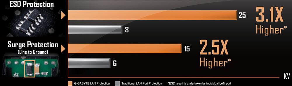 Bo mạch chủ GIGABYTE sử dụng IC có mức điện trở ESD gấp 3 lần so với IC truyền thống. Điều này giúp bảo vệ bo mạch chủ và các linh kiện của bo mạch chủ tốt hơn trước những thiệt hại có thể xảy ra bởi tĩnh điện.