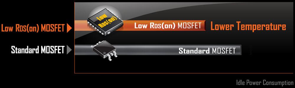 Bo mạch chủ GIGABYTE sử dụng MOSFET có RDS (off) thấp giúp giảm thiểu tiêu hao điện năng và lượng nhiệt thừa không cần thiết. Tất cả điều này nhằm hướng tới mục tiêu sử dụng điện năng hiệu quả, mang tới lợi ích cho cả người dùng cuối và doanh nghiệp mà không ảnh hưởng đến hiệu năng hệ thống.