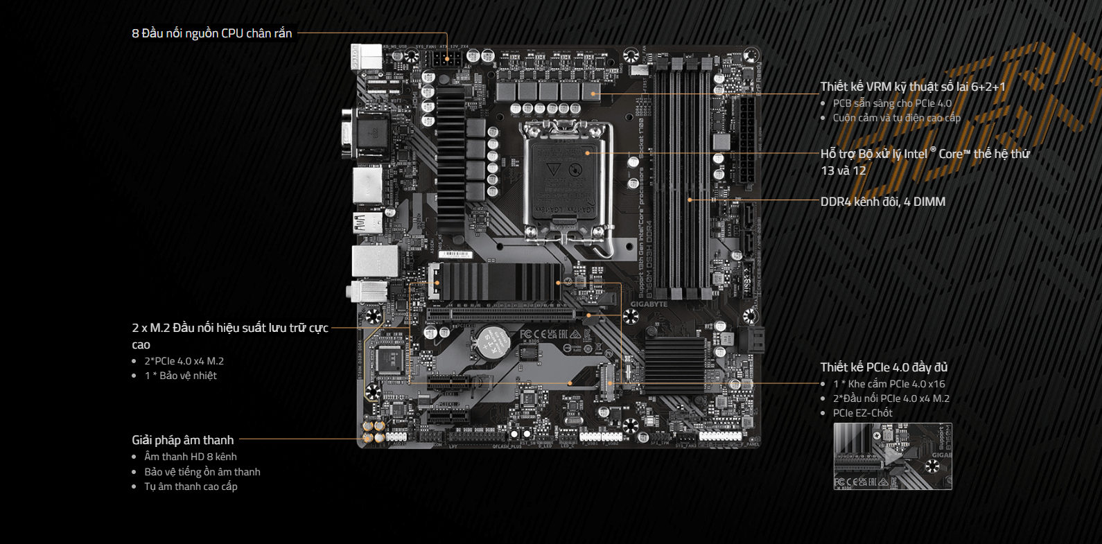 • Socket: LGA1700 hỗ trợ CPU Intel thế hệ thứ 12, 13 và 14