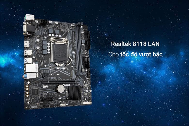 Mainboard GIGABYTE H410 M-H V3 được tích hợp mạng Realtek 8118 LAN – chip mạng có hiệu suất cao và ổn định với phân bổ băng thông hoàn toàn tự động nhằm đảm bảo hiệu năng mạng cao nhất đáp ứng tối ưu cho quá trình công việc cũng như giải trí của bạn. Nó có thể cung cấp cho người dùng những hiệu năng tốt nhất và kết nối Internet mượt mà và nhanh chóng.