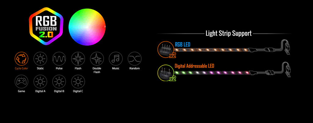 RGB Fusion 2.0 cho phép người dùng điều chỉnh dải đèn RGB trên bo mạch chủ theo sở thích của họ, sẽ cung cấp khả năng chiếu sáng LED địa chỉ 5v hoặc 12v và lên đến 300 đèn LED cung cấp nhiều lựa chọn hơn để người dùng sử dụng.
