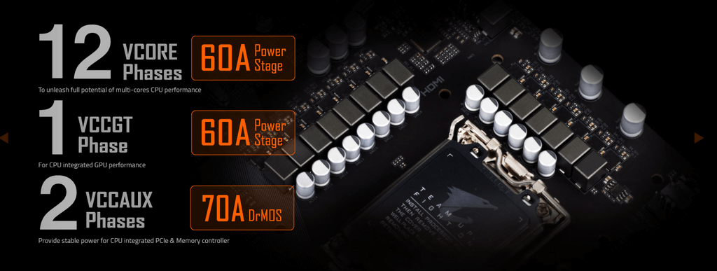 Đầu tư thiết kế VRM tốt nhất được sản xuất từ các vật liệu chất lượng cao, đảm bảo Turbo Boost hoạt động tối ưu thông qua quá trình ép xung khi CPU Intel thế hệ mới hoạt động. 12 VCORE pha 60A giúp tận dụng tối đa tiềm năng của hiệu suất CPU đa lõi. 1 VCCGT pha 60A cho hiệu suất GPU tích hợp CPU. 2 VCCAUX pha 70A DrMDS đảm bảo cung cấp dòng điện ổn định giữa bộ điều khiển PCIe và bộ nhớ tích hợp CPU.