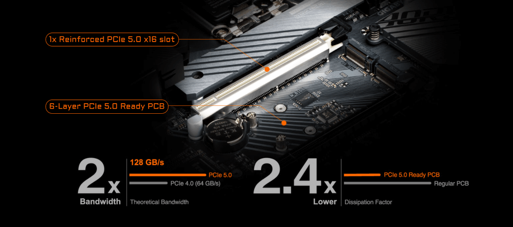 PCIe 5.0 trên Z690M Aorus Elite đem lại tốc độ gấp đôi so với PCIe 4.0 trước đó. Duy trì tính toàn vẹn của dữ liệu và có được tốc độ cao thì Gigabyte R & D lựa chọn PCB trở kháng thấp để giữ cho nó hoạt động. Bên cạnh đó cũng sử dụng giáp siêu bền SMD PCIe 5.0 cùng thiết kế bảo vệ bằng thép không gỉ độc quyền GIGABYTE.