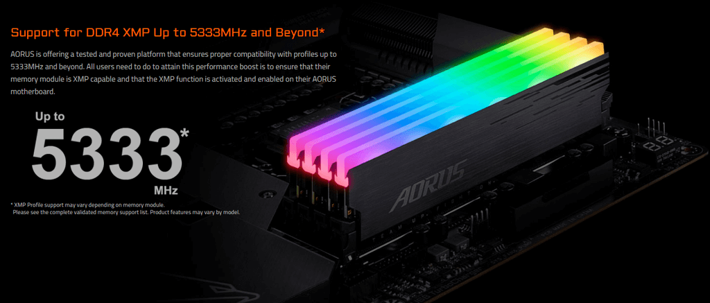 Main sử dụng ram DDR4 đừng quên bật tính năng XMP để có được băng thông lên đến 5333MHz. Tất cả các định tuyến bộ nhớ đều được mã hoá dưới lớp PCB chắc chắn. Trải nghiệm mượt mà hơn với băng thông bộ nhớ tối đa trên main là 128GB. Giờ đây, có nhiều lựa chọn hơn dành cho các ứng dụng sử dụng nhiều bộ nhớ để trích xuất và biên tập video cho người dùng thoải mái sử dụng.