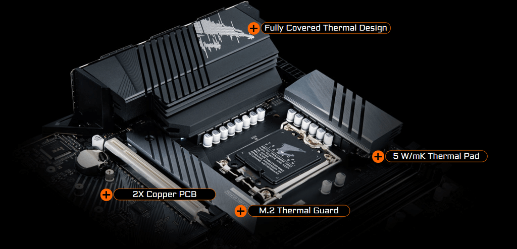Mosfet có độ bền cao và tản nhiệt được tích hợp hỗ trợ quá trình tản nhiệt tốt hơn. Sử dụng tấm đệm dẫn nhiệt 5 W/mK dày hơn 1,5 mm cho phép truyền nhiệt nhiều hơn 2,7 lần so với tấm tản nhiệt truyền thống. Trang bị M. 2 Thermal Guard giải quyết triệt để tình trạng “nghẽn cổ chai” với ổ cứng SSD M. 2 tốc độ cao. Thiết kế PCB bằng đồng 2x giúp hạ nhiệt độ của linh kiện vô cùng nhanh chóng với khả năng chịu nhiệt cao cùng trở kháng thấp.