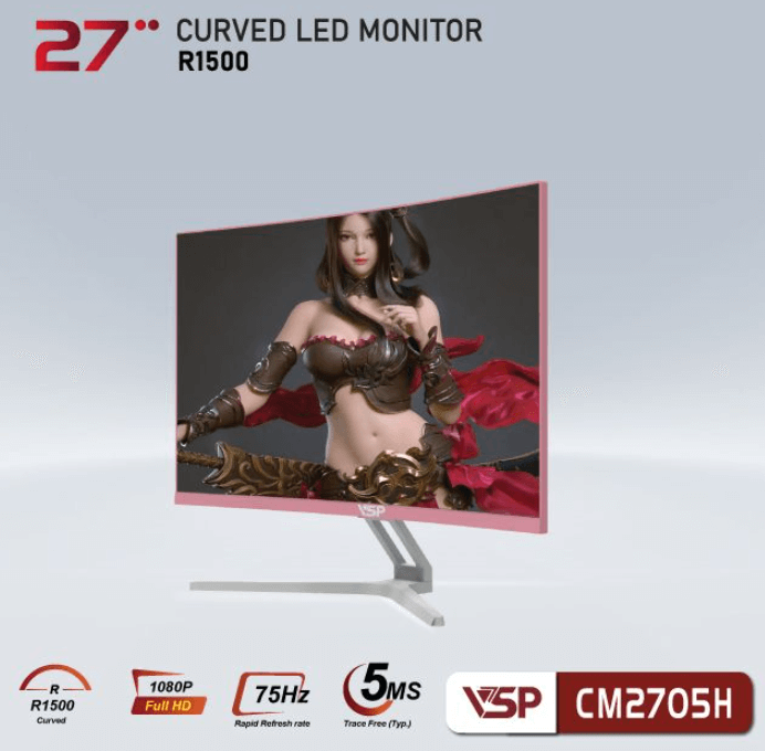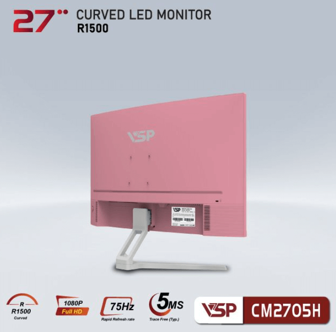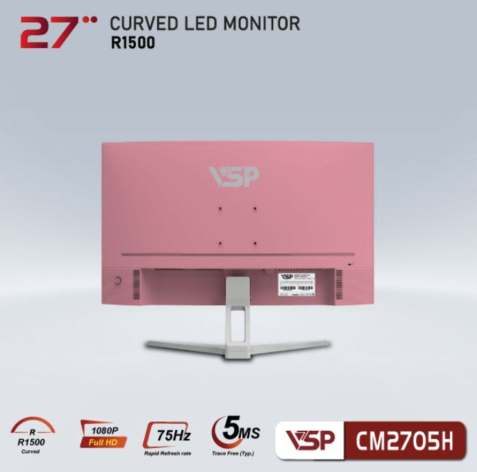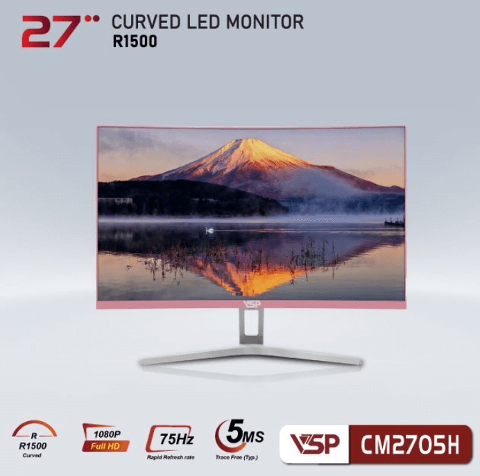 Màn hình VSP CM2705H series được trang bị tấm nền VA, có độ cong R1500 và tần số đáp ứng 75Hz với độ phân giải full HD 1920 x 1080 px. Thiết kế cong R1500 mang đến trải nghiệm hình ảnh sống động, phù hợp cho học tập, giải trí và làm việc.
