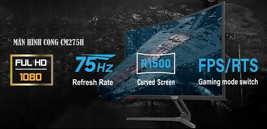 Màn hình cong VSP với tần số làm tươi 75Hz giúp hạn chế giật hình, mang đến trải nghiệm chơi game mượt mà. VSP tối ưu hóa màu sắc và độ tương phản, giúp bạn tận hưởng từng khoảnh khắc tuyệt vời trong game. Tốc độ phản hồi chỉ 5ms đảm bảo chuyển động nhanh được thể hiện rõ ràng, không bị mờ hay rung.