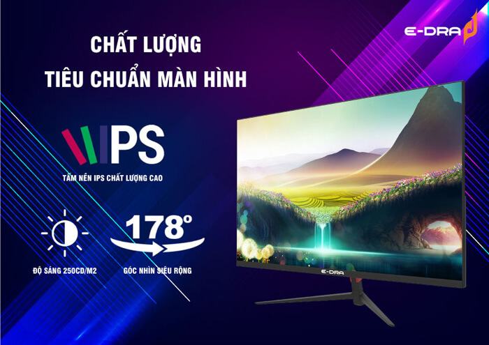 Chất lượng hiển thị của EDRA – EGM24F100s đạt tiêu chuẩn với kích thước 23.8 inch và độ phân giải FHD (1920×1080), mang lại khả năng hiển thị sắc nét cho từng chi tiết. Với tấm nền IPS, màn hình này cho phép hình ảnh có màu sắc tươi sáng hơn và mở rộng góc nhìn lên tới 178 độ mà không bị sai lệch màu.