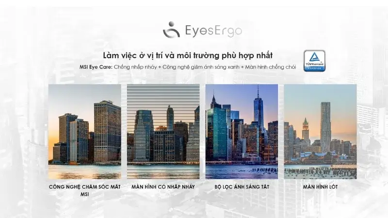 Một trong những điểm nổi bật của MSI PRO MP273AW là các công nghệ bảo vệ mắt hiện đại. Công nghệ Anti-Flicker giảm thiểu hiện tượng nhấp nháy, nhờ đó giảm mỏi mắt khi sử dụng kéo dài. Chế độ Less Blue Light PRO giảm ánh sáng xanh gây hại, bảo vệ mắt và cải thiện giấc ngủ. Lớp phủ Anti-Glare cũng giúp giảm độ chói, tạo điều kiện làm việc thoải mái hơn trong môi trường sáng.