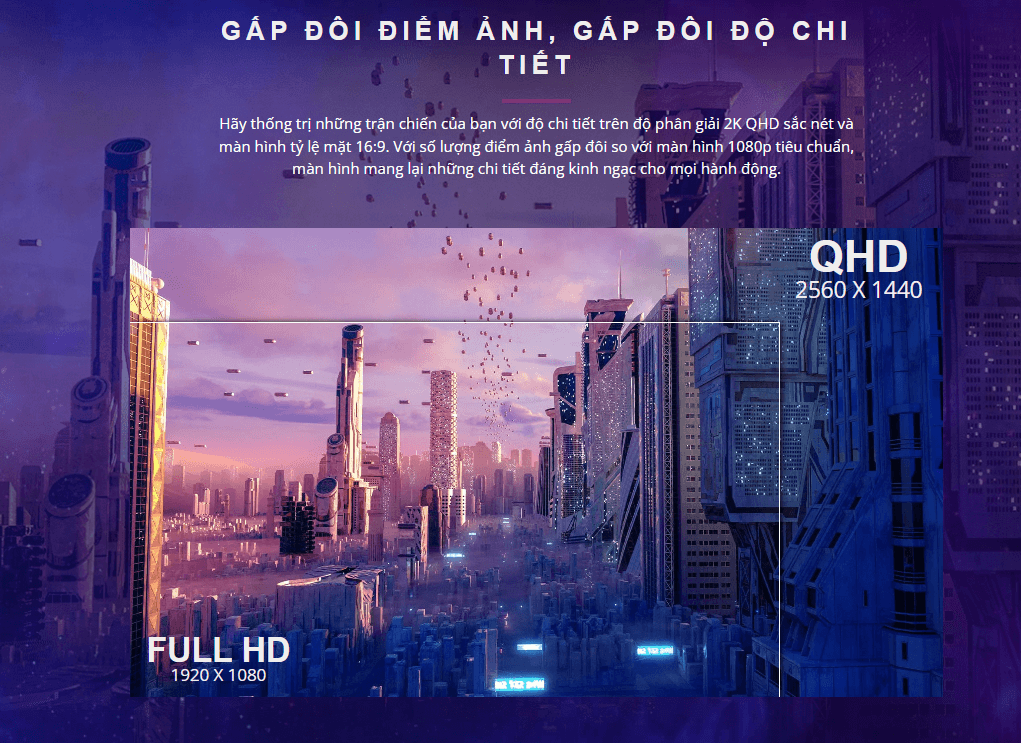 Chiến thắng trong trò chơi với độ rõ nét như pha lê từ độ phân giải 2K QHD sắc nét, với tỷ lệ khung hình 16:9 như một bộ phim. Màn hình này sở hữu số lượng pixel gấp đôi so với màn hình tiêu chuẩn 1080p, mang đến hình ảnh chi tiết vượt trội mà không gặp phải hiện tượng biến dạng.