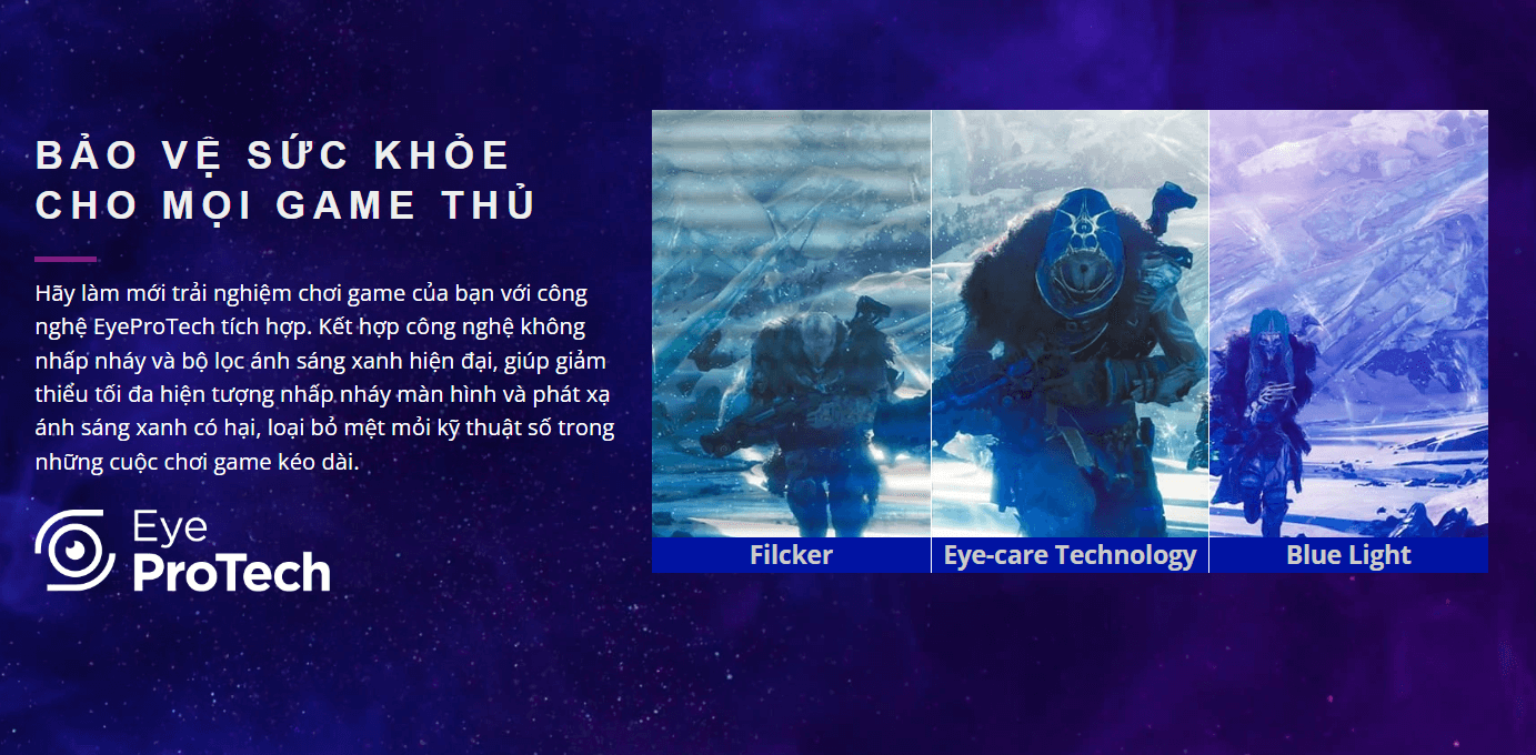 Với công nghệ EyeProTech giúp lọc ánh sáng xanh và ngăn chặn hiện tượng nhấp nháy, màn hình này giúp giảm thiểu tình trạng nhấp nháy và phát thải ánh sáng xanh có hại, loại bỏ cảm giác mỏi mắt và đau mắt cho người dùng trong suốt quá trình sử dụng.