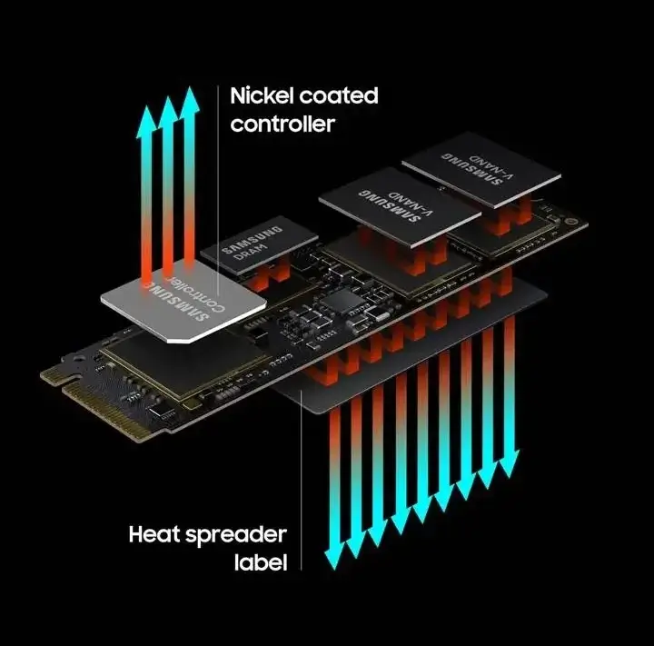 Trong khi hầu hết các ổ SSD NVMe hiệu suất cao ngày nay phải nhờ tới tấm tản nhiệt bằng đồng bên ngoài để tản nhiệt, ổ SSD Samsung 980 PRO 1TB sử dụng lớp phủ niken trên bo mạch cũng như tấm tản nhiệt ở phía sau của SSD giúp quản lý nhiệt hiệu quả. Các chức năng tản nhiệt tiên tiến này cũng cho phép ổ đĩa duy trì kiểu dáng M. 2 nhỏ gọn và mỏng. Công nghệ Dynamic Thermal Guard của Samsung tiếp tục đảm bảo rằng nhiệt độ của ổ đĩa cứng duy trì ở mức tối ưu, hạn chế hiện tượng giảm tốc độ khi làm việc cường độ cao trong thời gian dài.