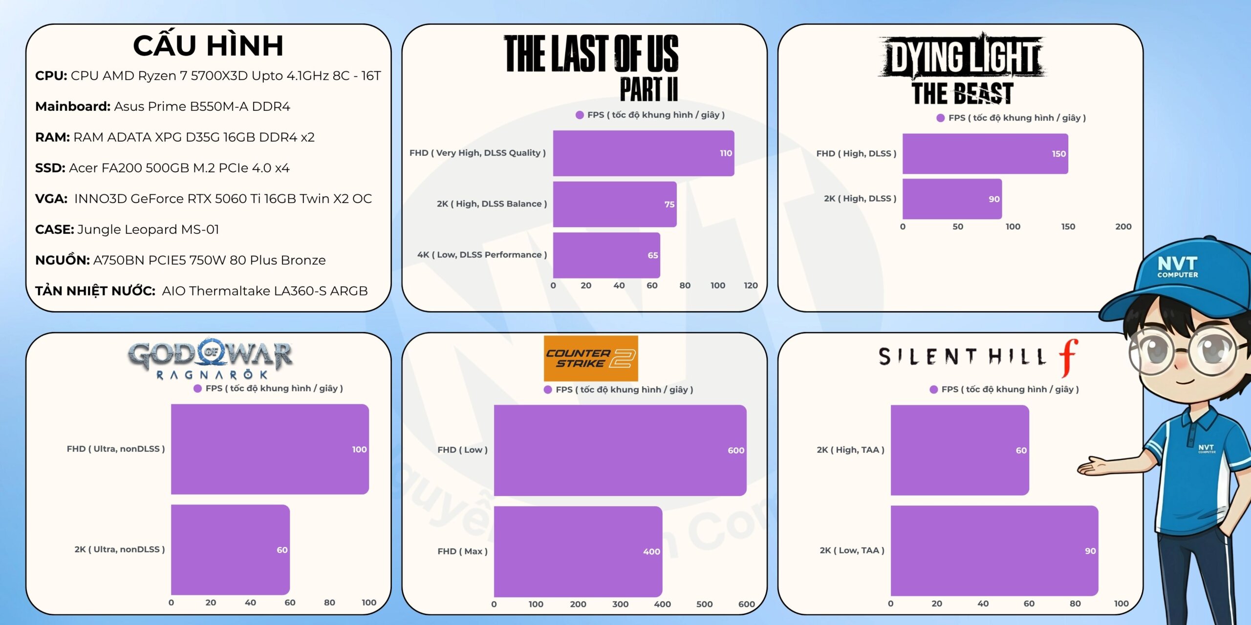 Lưu ý: Thông số FPS trên được đo trong điều kiện và cấu hình cụ thể, chỉ mang tính chất tham khảo. Hiệu năng thực tế có thể thay đổi tùy thuộc vào phiên bản game, driver, nhiệt độ và các yếu tố phần cứng/phần mềm khác.