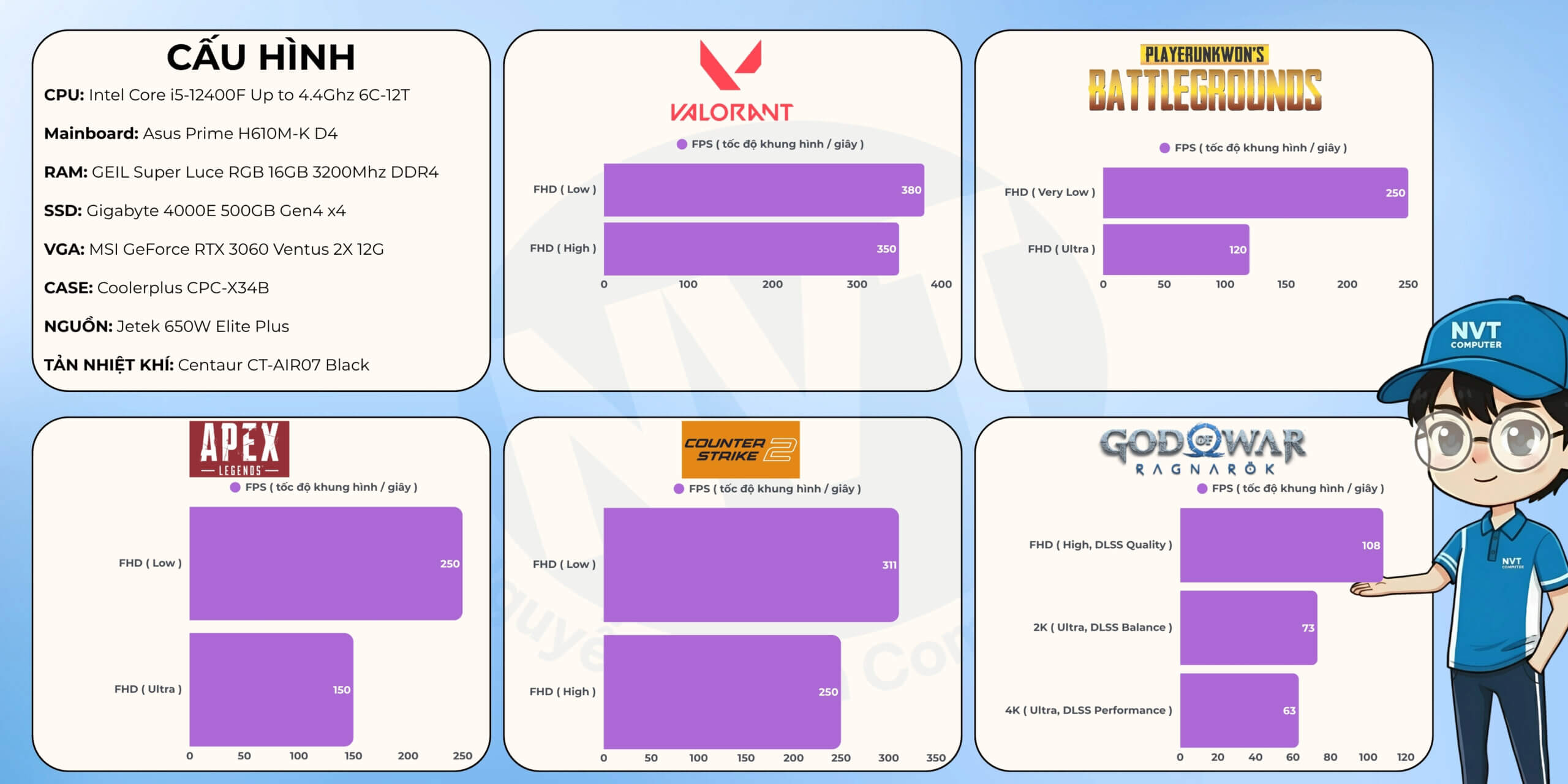 Lưu ý: Thông số FPS trên được đo trong điều kiện và cấu hình cụ thể, chỉ mang tính chất tham khảo. Hiệu năng thực tế có thể thay đổi tùy thuộc vào phiên bản game, driver, nhiệt độ và các yếu tố phần cứng/phần mềm khác.