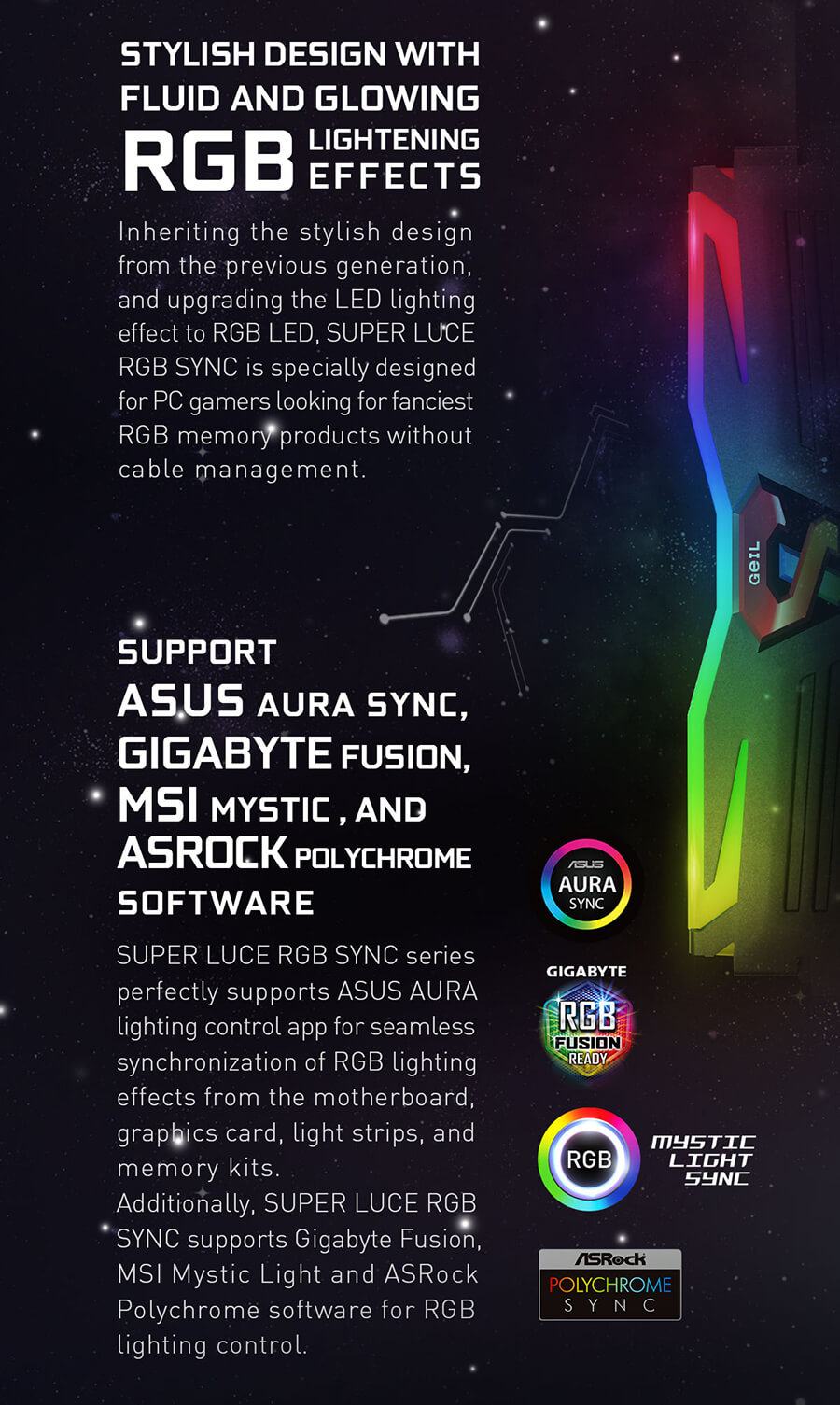 Với việc kế thừa nét bề ngoài sang trọng từ phiên bản tiền nhiệm cùng sự cải tiến từ hiệu ứng ánh sáng LED sang LED RGB, SUPER LUCE RGB SYNC được phát triển dành cho các game thủ PC đang tìm kiếm sản phẩm bộ nhớ phù hợp nhất với ánh sáng RGB, mà không còn quá lo ngại về vấn đề quản lý dây cáp.
