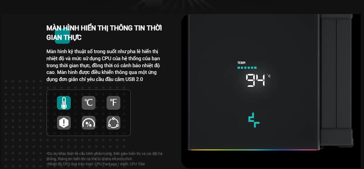 Sản phẩm được trang bị màn hình hiển thị kỹ thuật số, cho phép theo dõi nhiệt độ, mức sử dụng CPU và cảnh báo nhiệt độ cao. Mọi thông tin đều có thể được quản lý dễ dàng qua ứng dụng kết nối bằng cổng USB 2.0.