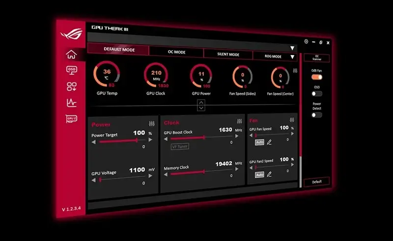 Phần mềm tích hợp cho phép người dùng theo dõi và điều chỉnh thông số của ASUS Dual GeForce RTX 3050 OC Edition 6GB theo nhu cầu và các tác vụ khác nhau. Ngoài ra, người dùng cũng có thể điều chỉnh quạt để tối ưu hóa hiệu suất của card.