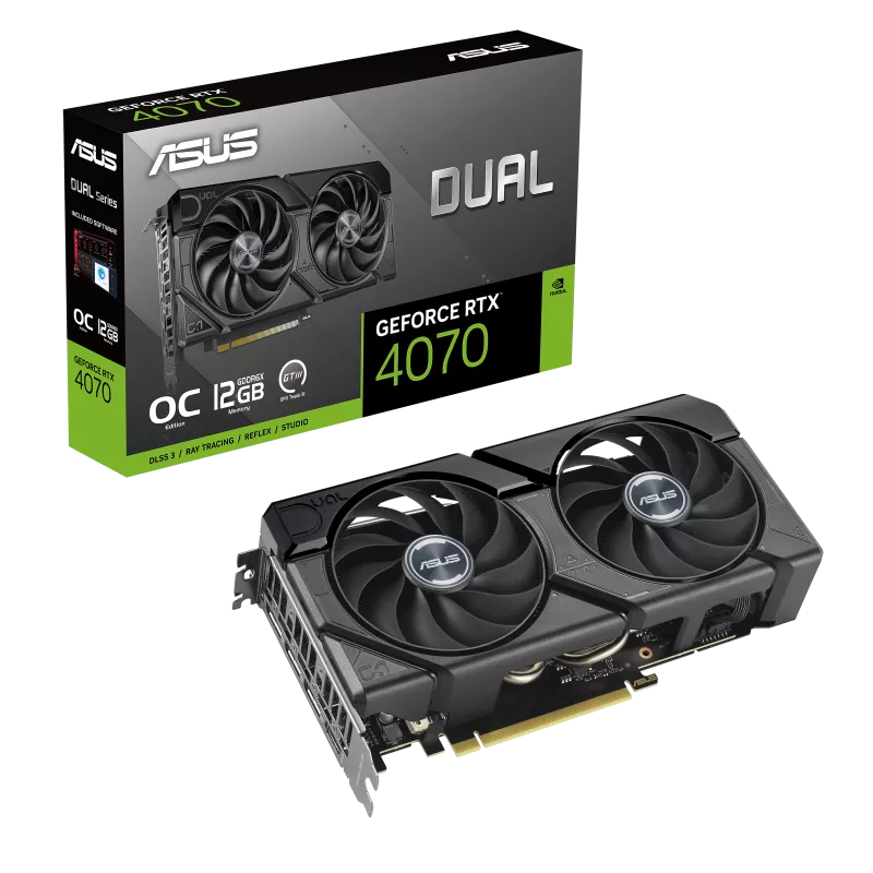 Về hiệu suất, ASUS Dual GeForce RTX 4070 EVO OC Edition được trang bị 12GB GDDR6X, cung cấp tốc độ bộ nhớ cao và băng thông lớn, lý tưởng cho các tựa game AAA hiện đại cũng như các ứng dụng đồ họa chuyên sâu. Chế độ OC (ép xung) đẩy xung nhịp lên tới 2550 MHz (so với 2520 MHz ở chế độ mặc định), tối ưu hóa sức mạnh của GPU NVIDIA GeForce RTX 4070. Sản phẩm hỗ trợ các công nghệ tiên tiến như DLSS 3, HDMI 2.1a, và DisplayPort 1.4a, đảm bảo trải nghiệm hình ảnh mượt mà với độ phân giải tối đa lên đến 7680 x 4320.